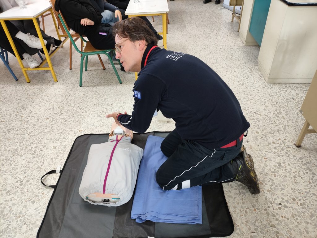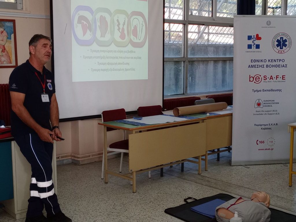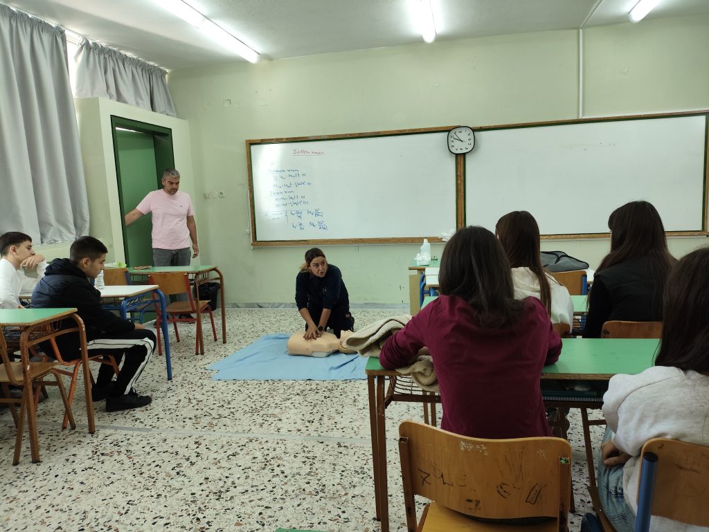 Με πρωτοβουλία του καθηγητή Θεολογίας κ. Σαλιακούρα Νικολάου, το 1 ο Γενικό Λύκειο Καβάλας και ο διευθυντής κ. Γεωργιάδης Κωνσταντίνος υποδέχτηκαν κλιμάκιο του ΕΚΑΒ, την Πέμπτη 16 Οκτωβρίου προκειμένου οι μαθητές και οι μαθήτριες του Α3 να συμμετάσχουν σ᾿ ένα πεντάωρο σεμινάριο με στόχο την παροχή πρώτων βοηθειών στις περιπτώσεις που απαιτείται καρδιοπνευμονική αναζωογόνηση (ΚΑΡΠΑ). Μετά από μια σύντομη, αλλά περιεκτική εισήγηση ενός εκ των διασωστών η οποία αφορούσε τους φορείς έκτακτης ανάγκης , τον τρόπο επικοινωνίας ενός πολίτη μ᾿ αυτούς, τις συνθήκες που απαιτούν τη συνδρομή αυτών των σωμάτων ασφαλείας, καθώς και τις βασικές γνώσεις ανατομίας και λειτουργίας εγκεφάλου, οργανώθηκαν ομάδες μαθητών/μαθητριών. Με τη βοήθεια εκπαιδευτών-διασωστών ενημερώθηκαν και δοκιμάστηκαν στις βασικές τεχνικές
