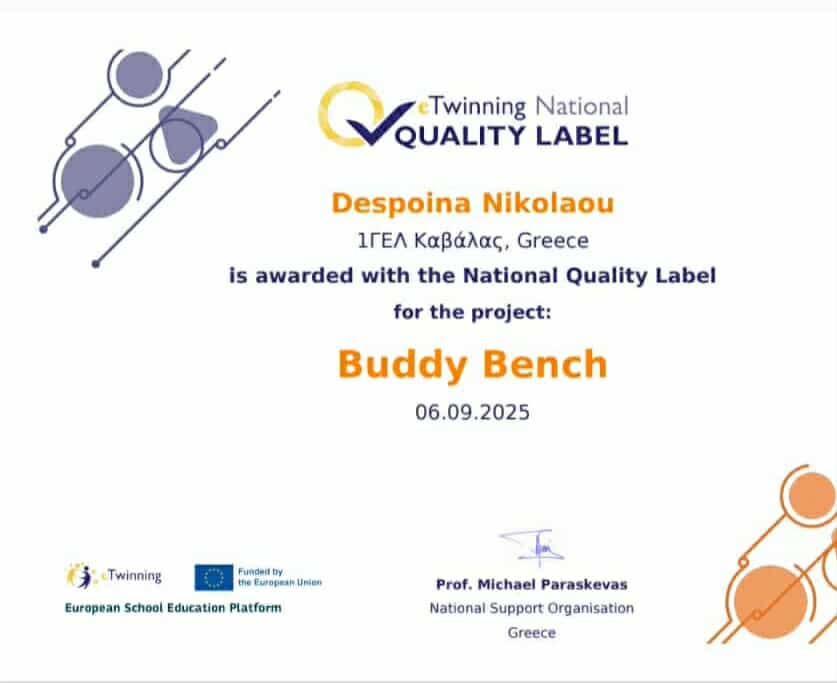 Με ιδιαίτερη χαρά και υπερηφάνεια ανακοινώνουμε ότι το σχολείο μας τιμήθηκε με την Εθνική Ετικέτα Ποιότητας για το eTwinning έργο “Buddy Bench”.