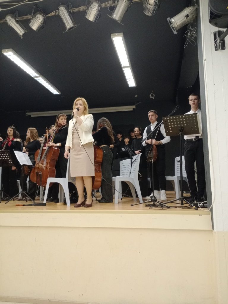 Μια ιδιαίτερη στιγμή ήταν όταν η ομάδα χορού του 1ου ΓΕΛ, ακολουθώντας τον ρυθμό της ορχήστρας και της χορωδίας, χόρεψε συρτάκι.